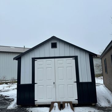 12' x 12' Utility Style , With 1 Window and Double Doors, White/Black Siding with Gable Roof Style