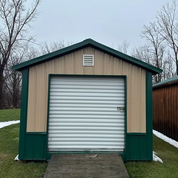 10' x 12' Utility Style, With 1 Roll Up Door, Green/Beige Siding with Gable Roof Style