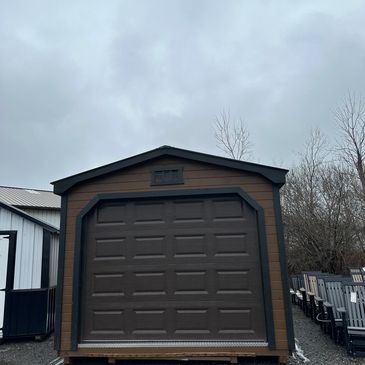 12'x24' Garage, front roll up door, 1 window, and single side man door, Brown Siding/Cedar Trim, with a Gable Roof Style